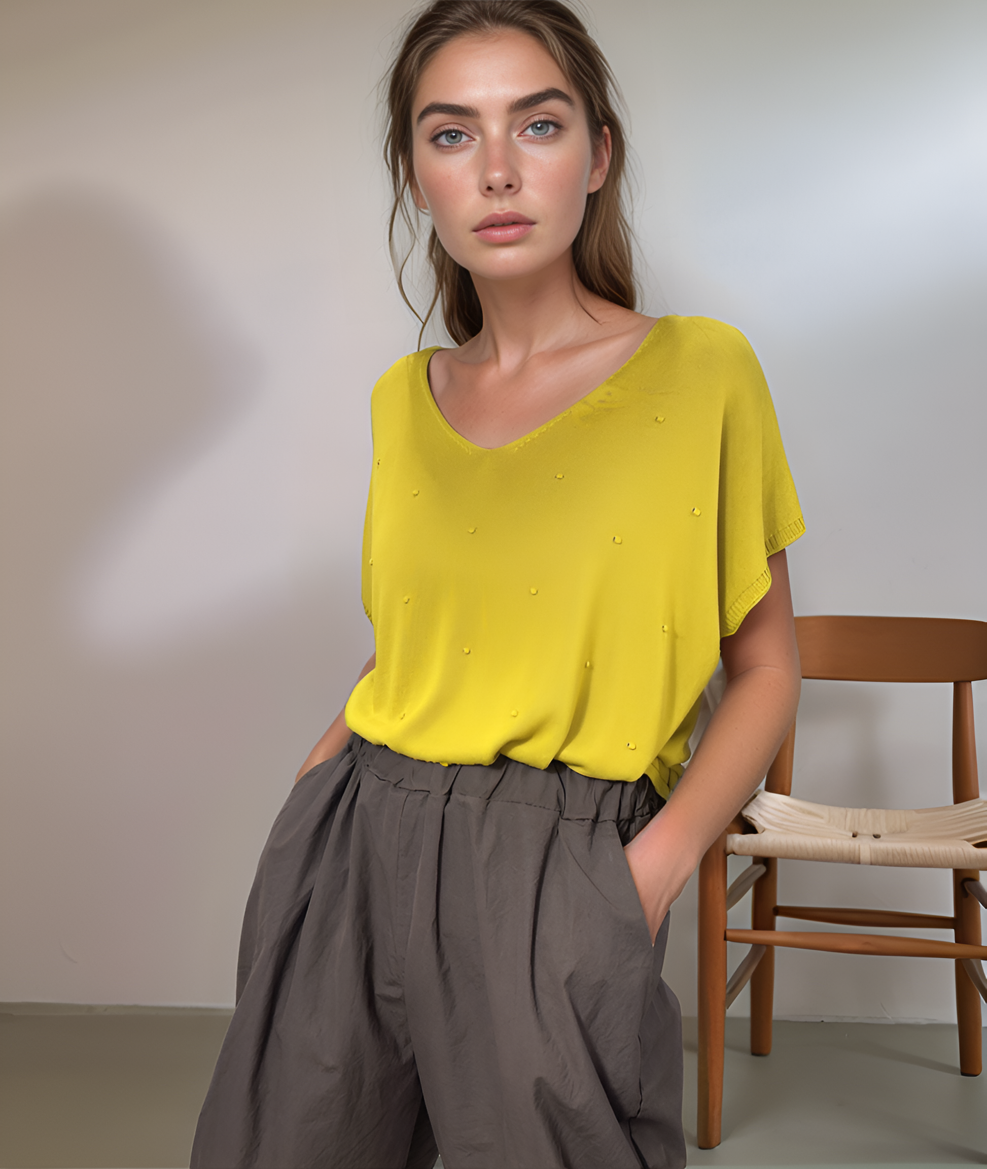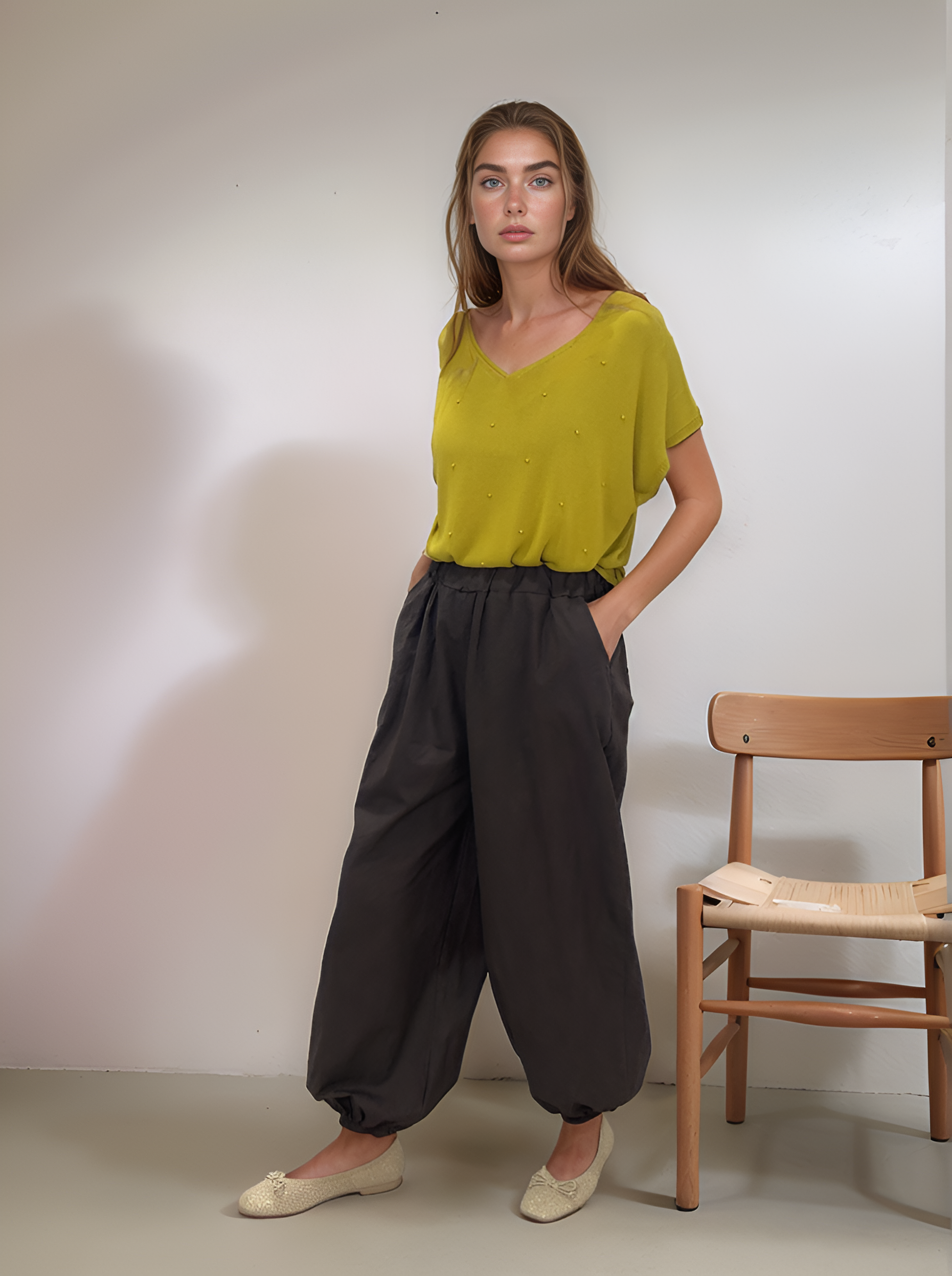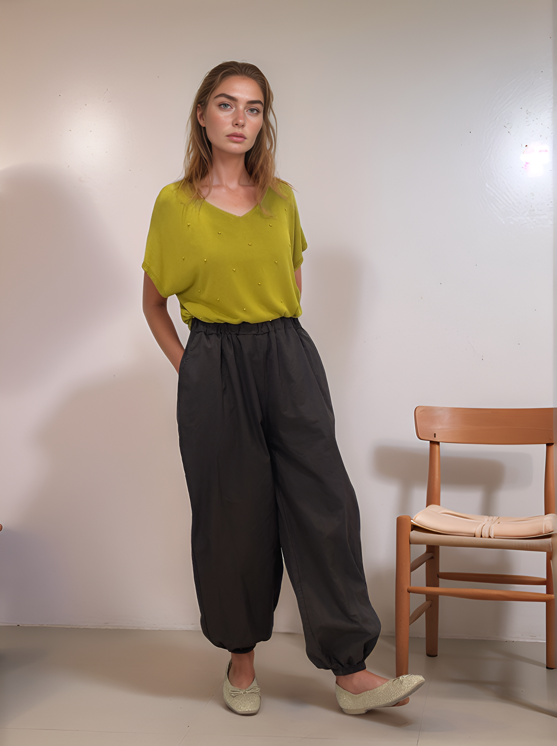 Calças em tecido de algodão, com bolsos e elástico no cós e pernas.