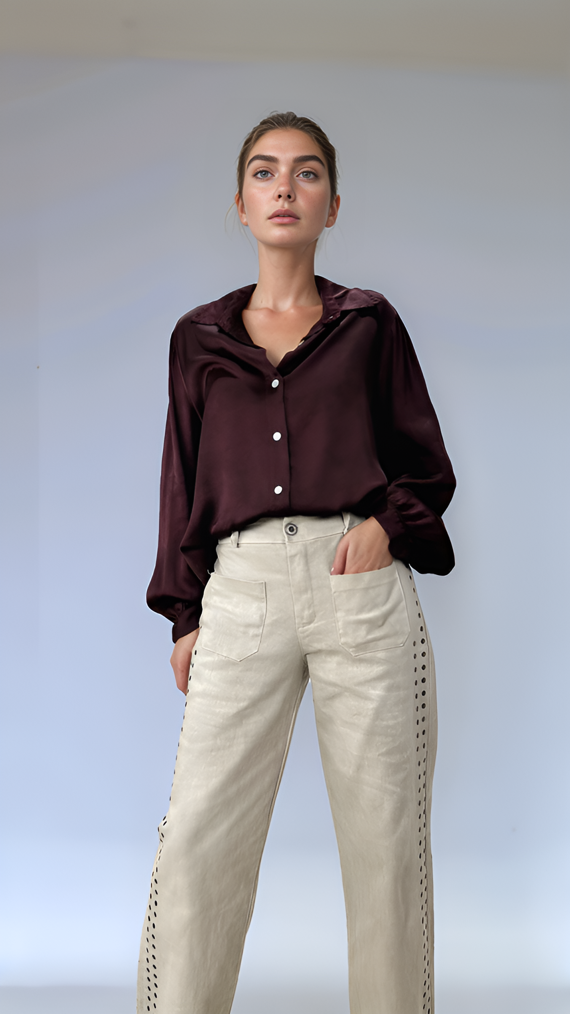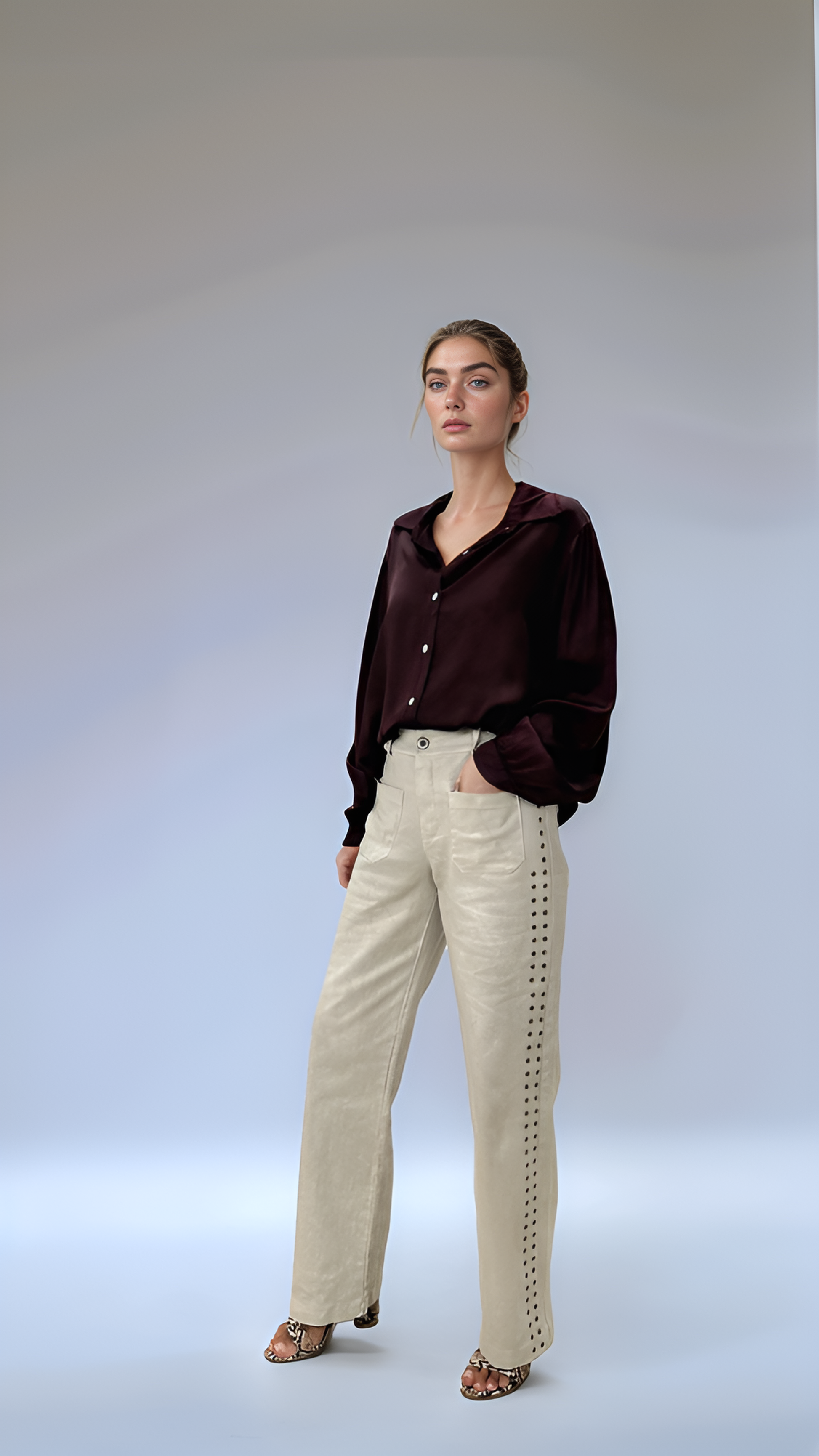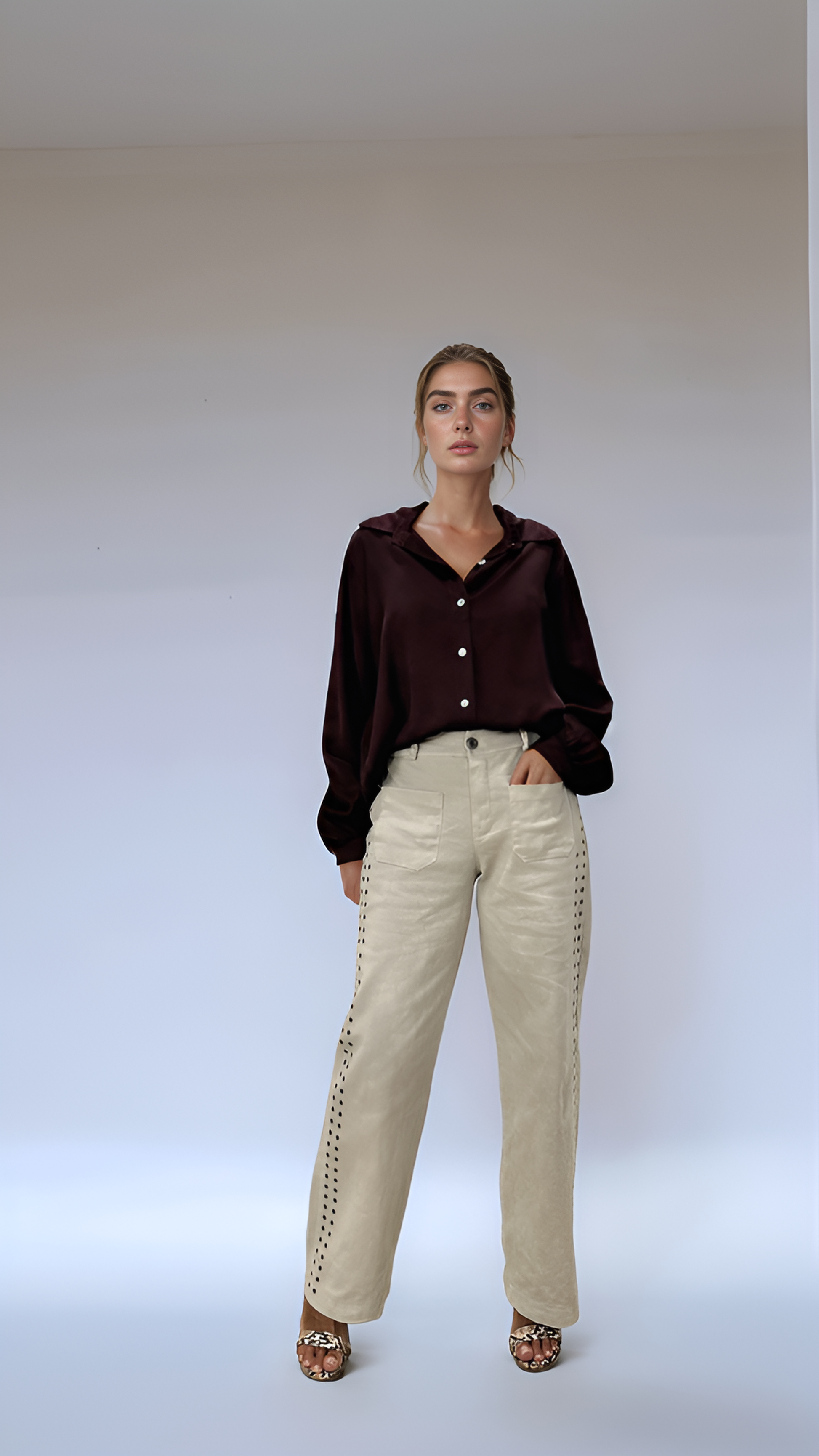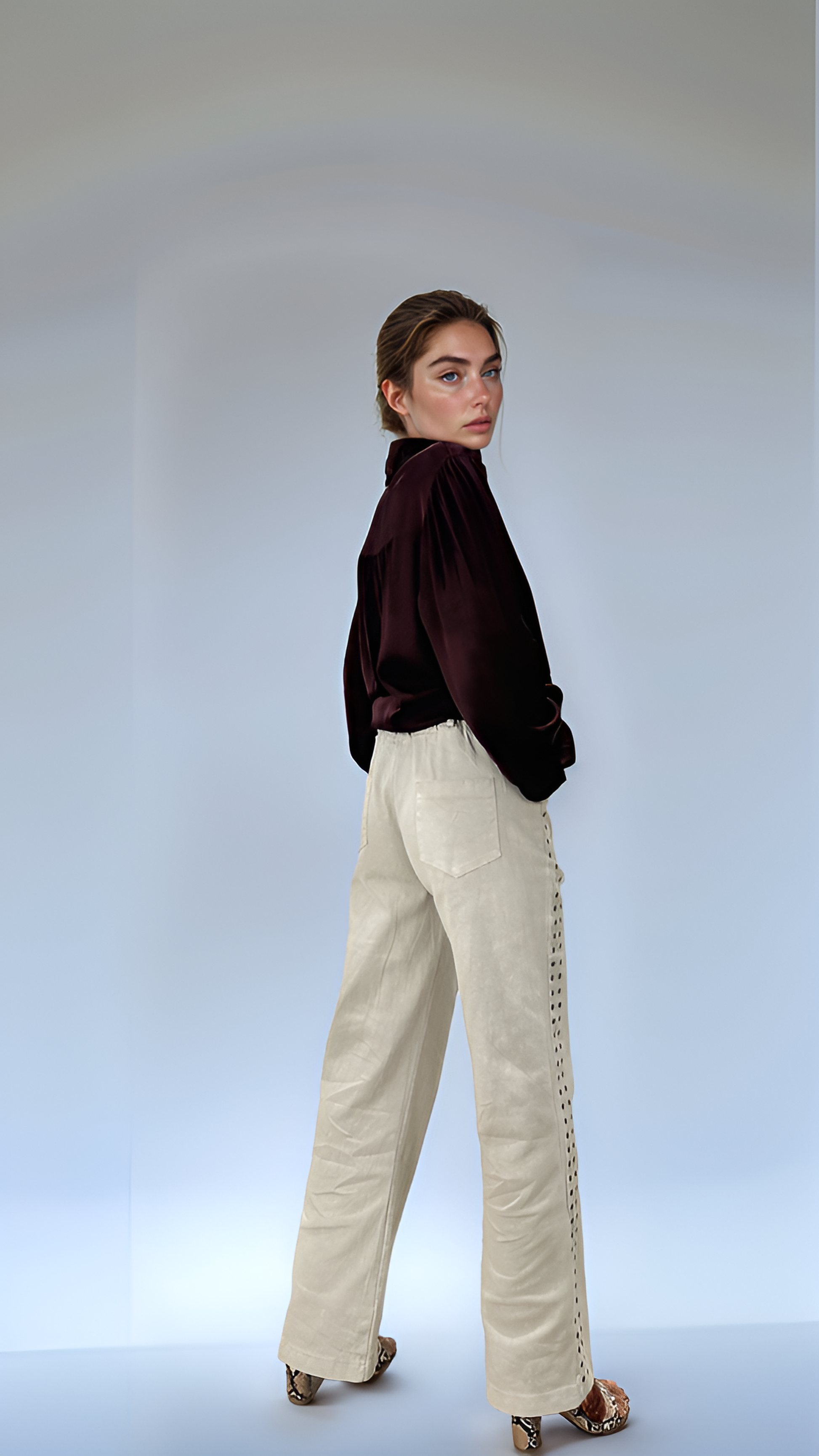 Calças em sarja de algodão em tom bege, com elasticidade e elástico no cós, pormenor de tachas (cor ouro velho), na lateral.