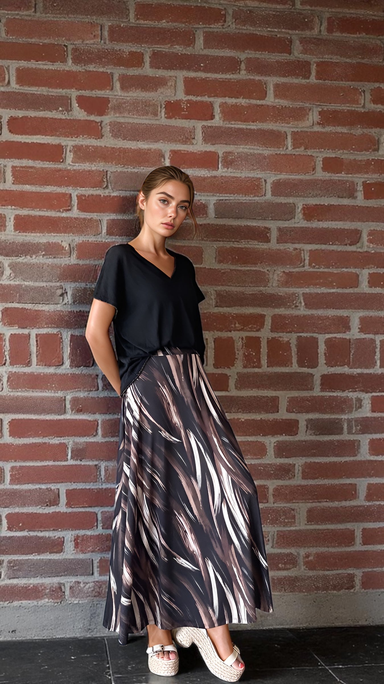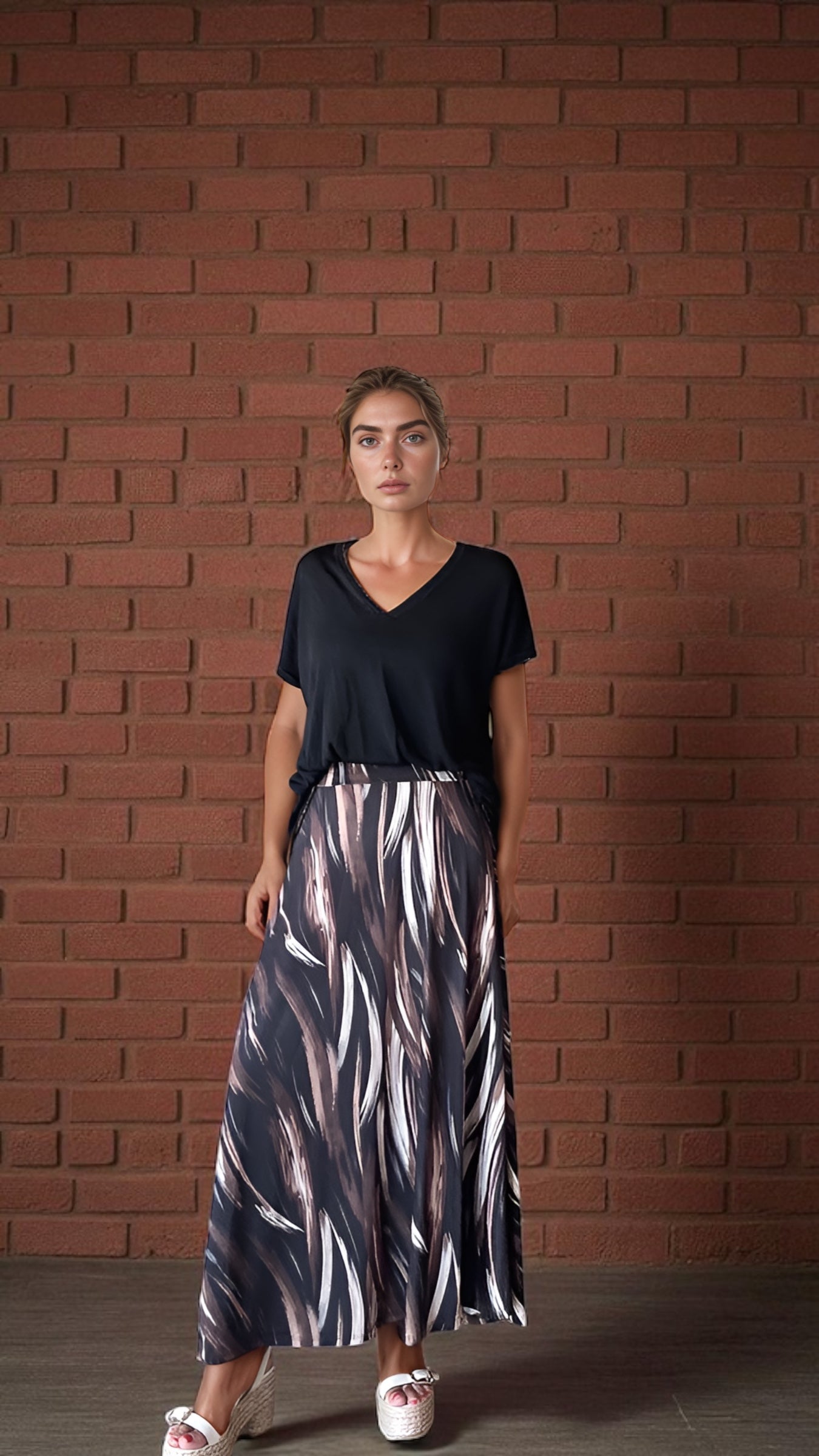 Saia em malha de seda com elástico no cós, não tem bolsos .