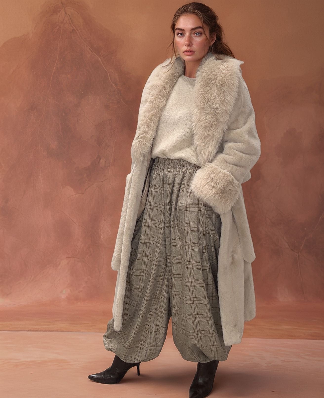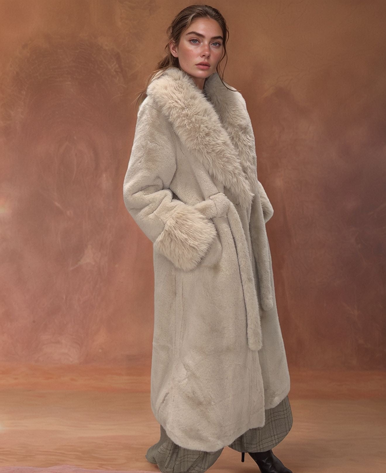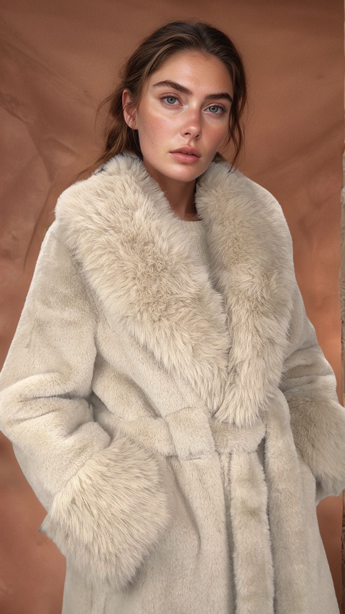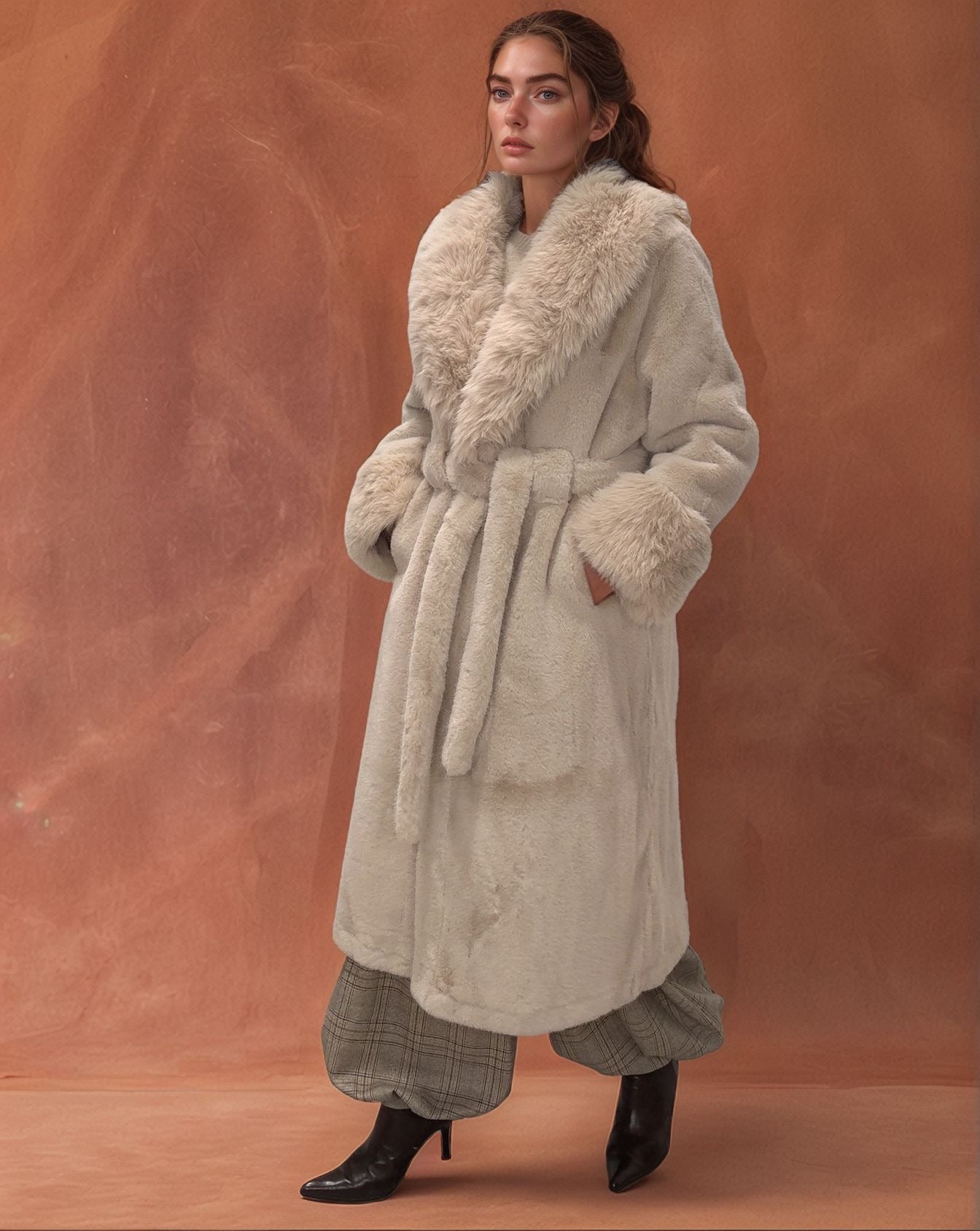 A peça de afirmação que o seu guarda-roupa de inverno precisava. Este casaco longo em pelo sintético premium combina uma estética luxuosa com um toque incrivelmente macio e acolhedor. Com um design envolvente, gola volumosa e punhos destacados, é a escolha ideal para quem não abdica do estilo mesmo nos dias mais gélidos.