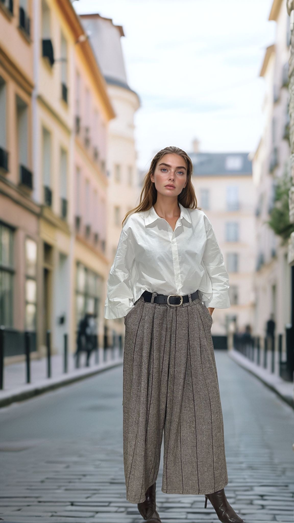 • Look Elegante: Vista as calças com uma camisa oversized ou blusa, como na imagem, e defina a cintura com um cinto. Complete com botins de salto pontiagudos em tons de castanho escuro ou preto, que alongam a silhueta.