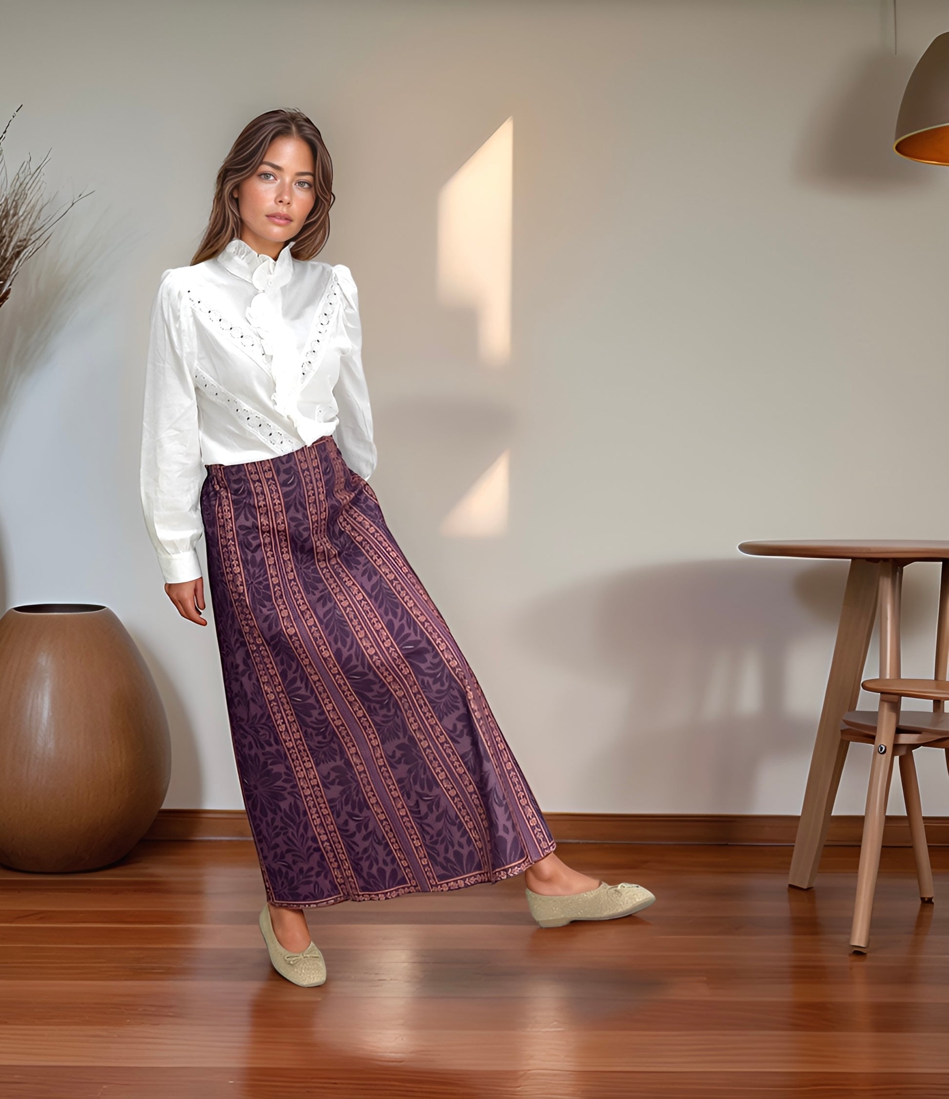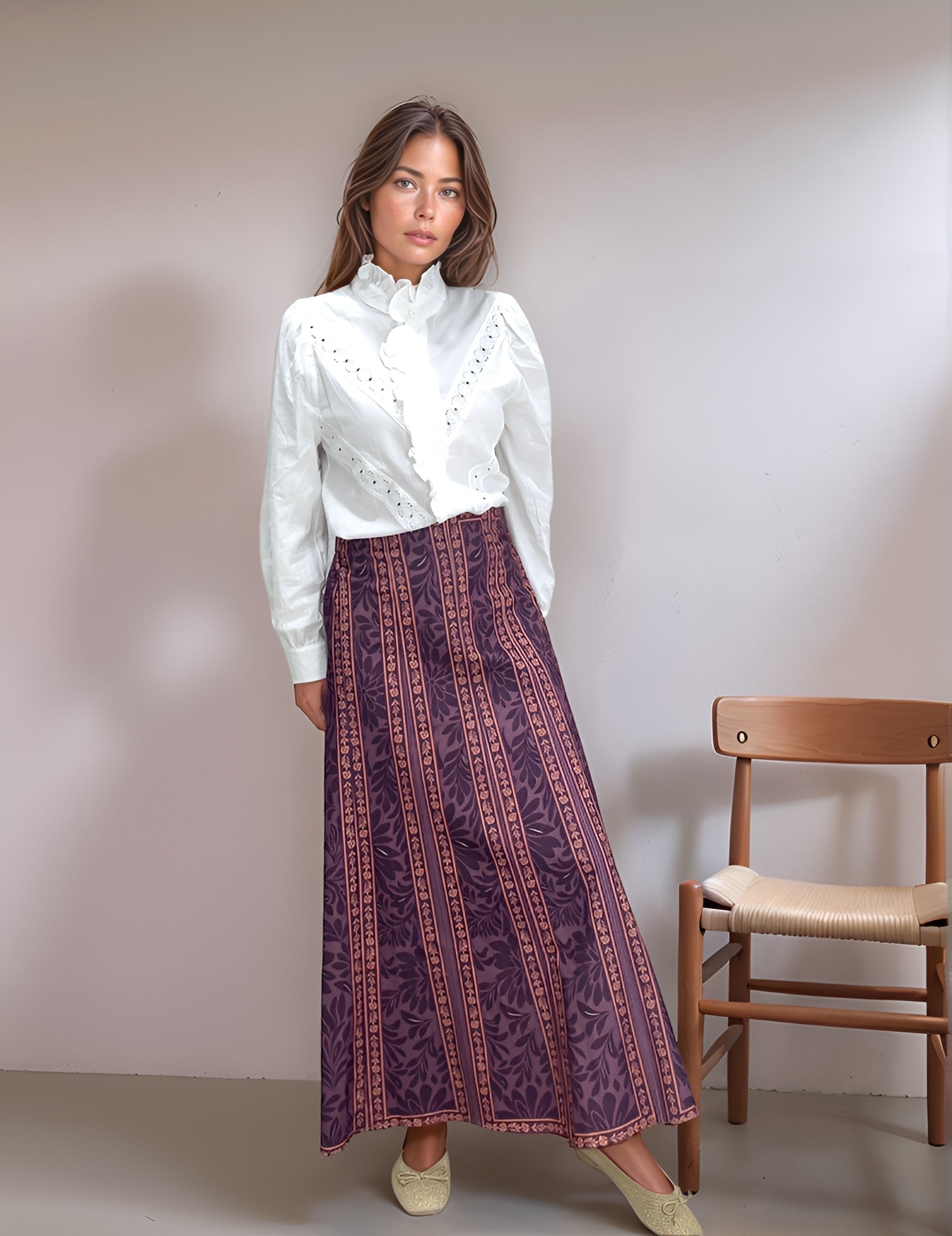 Saia em tecido de algodão com elástico no cós, tons laranja e roxo.