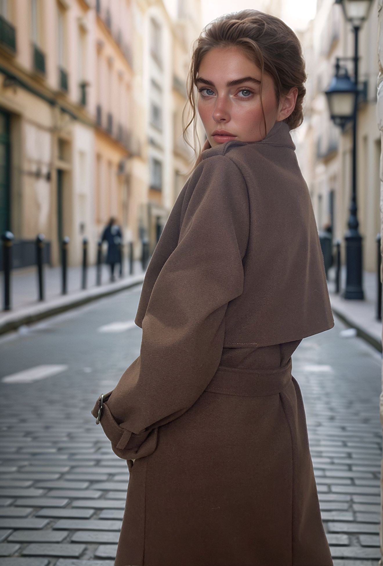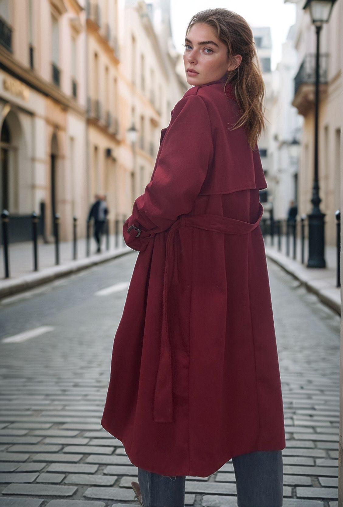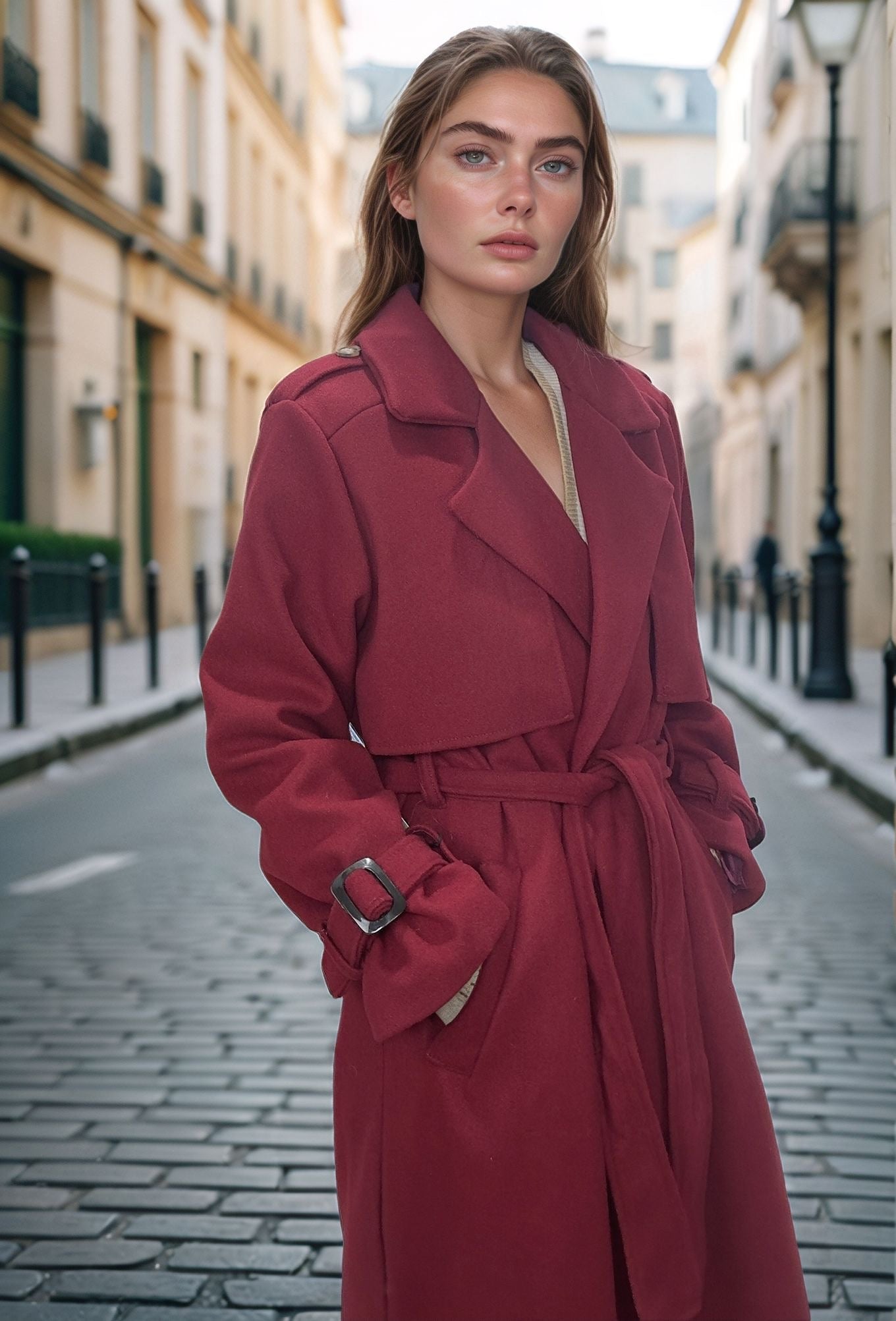 • Design Sofisticado: Apresenta lapelas largas, abas decorativas nos ombros e punhos ajustáveis com fivela, remetendo ao charme clássico europeu.